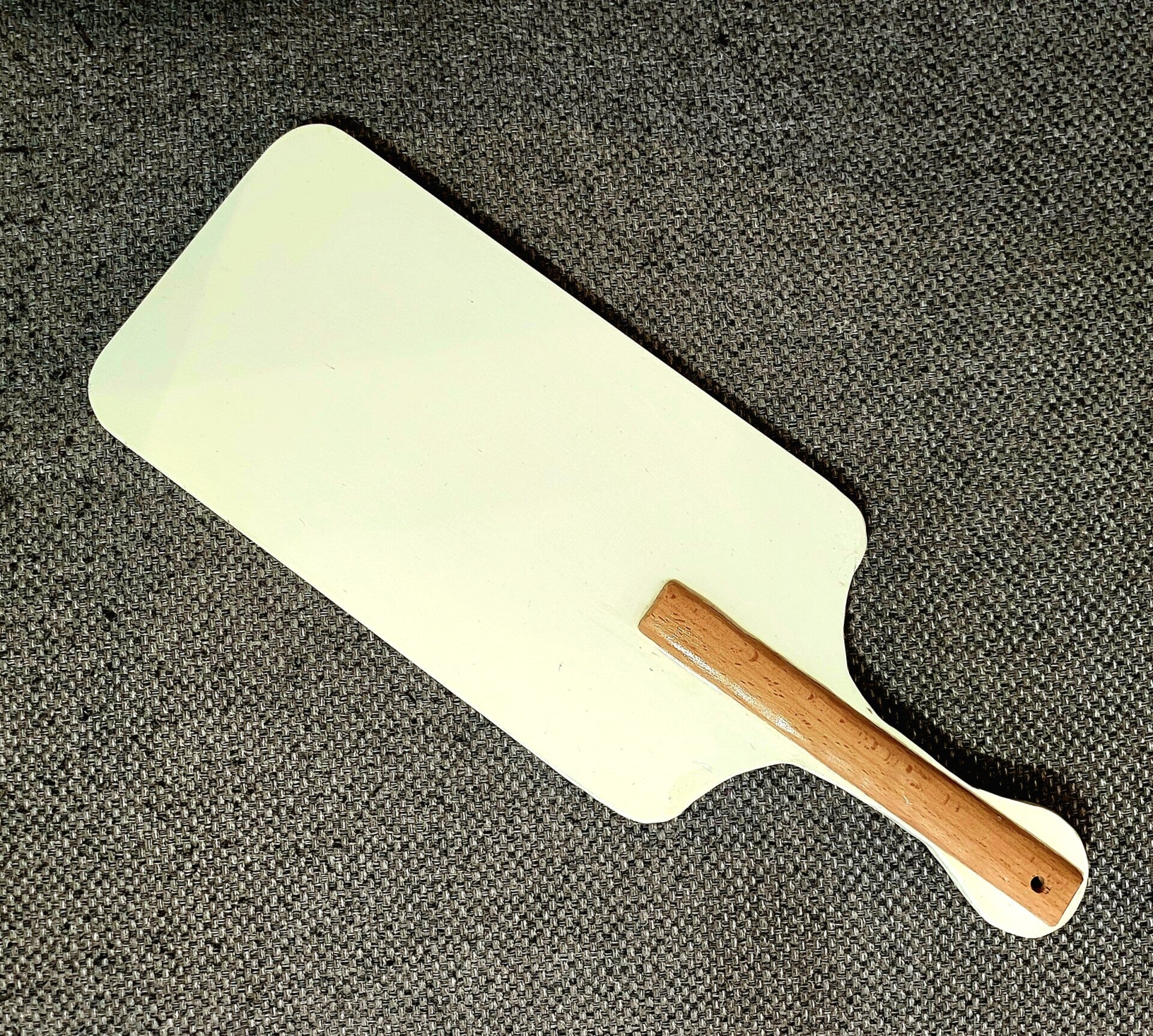Grand paddle en bois, corps du paddle en contreplaqué de pin vernis en blanc réhaussé de hêtre sur le manche.