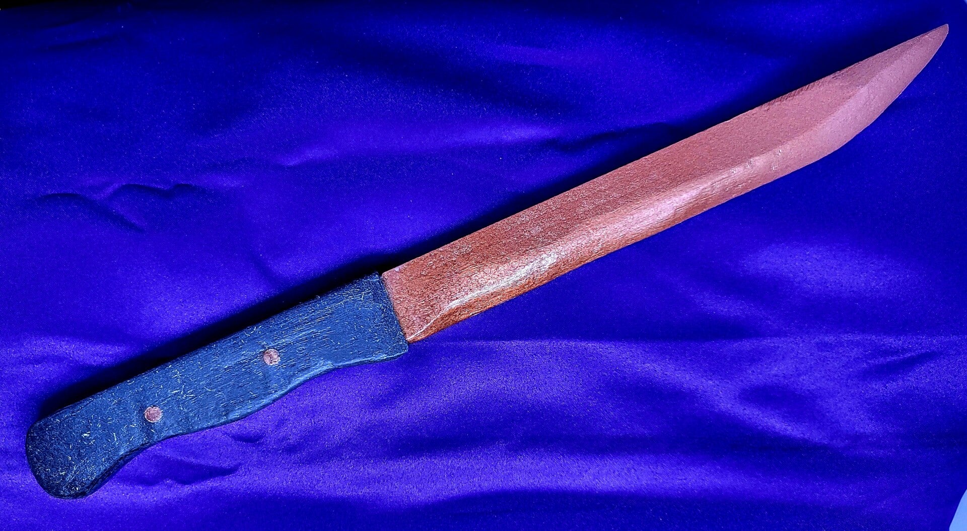 Couteau avec lame en hêtre peinte style bronze, manche en mdf noir, soie caché et reliée par 2 rivet en bois peint en bronze.
